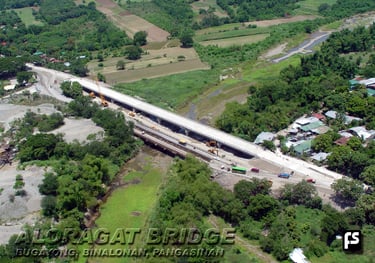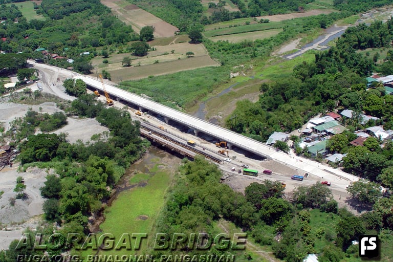 ALORAGAT BRIDGE over the Aloragat River, MacArthur Highway, between Pozorubio and Binalonan, Pangasinan. The Bridge was built by [FS] Foundation Specialists, Inc. as replacement of the old bridge which, over the years, had suffered multiple partial collapses due to local scouring caused by frequent severe flash floods due to water release during typhoons, from the upstream Binga Dam, When FS was awarded by the Department of Public Works & Highways the JBIC assisted Contract for the Construction of Aloragat Bridge, traffic across the river was confined to a Bayley bridge in need of continuous repairs due to traffic of heavy cargo trucks. Part of FS contract was the construction of a second Bayley bridge and the upgrading and maintenance of the existing one. The two Bayley bridges [visible in picture] had to be designed to traffic of heavy cargo and trailer trucks loaded with cement bags from nearby plants. For the construction of Post-tensioned girders for the Bridge, FS rented a site near the bridge and set up a 75 cubic meters per hour capacity automatic batching plant, cement silos, and casting beds. The batching plant also supplied concrete for the bored piles, the deck slab and other bridge structures. The large diameter Bored Piles were tested by PDA Tests, (Pile Dynamic Analysis) The bridge was inaugurated by the, at that time,, Speaker of the House, Joe De Venecia and by DPWH Secretary Edmundo Mir.